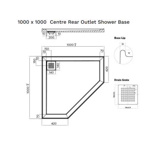 1000 x 1000 Angle Corner Rear Outlet Shower Base
