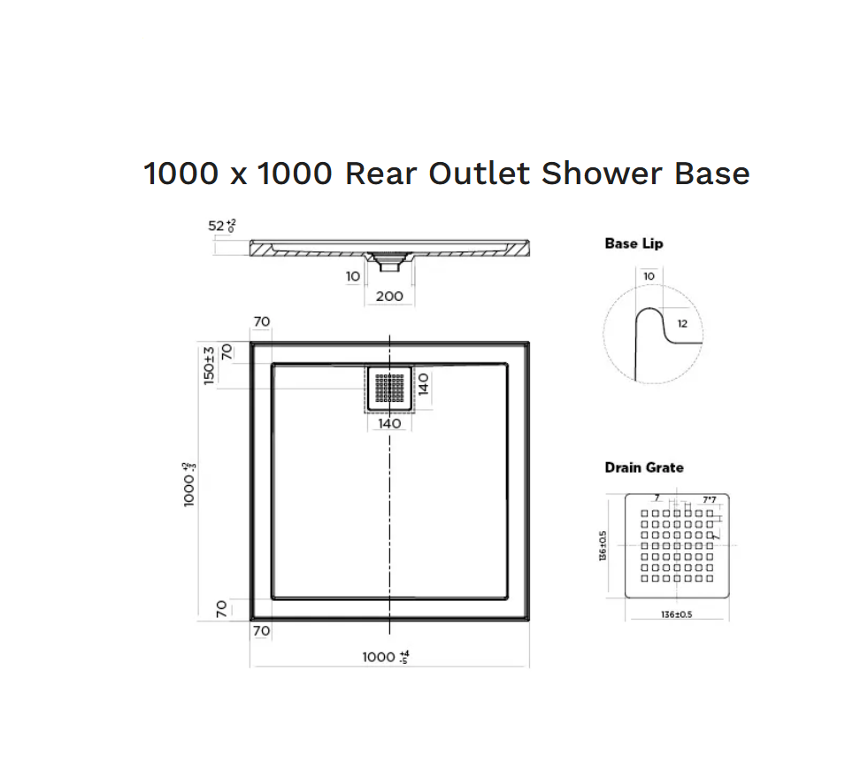 1m x 1m Sanitary grade gelcoat surface Stonelite* solid cast construction. 4 tile flanges to help prevent leakage. Square Chrome Grate included Matte Black and White grate option available Cement based tile adhesive or mortar bed installation Profile 50mm Bases can be rotated to allow for alternative waste positions